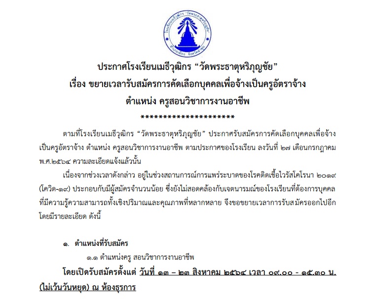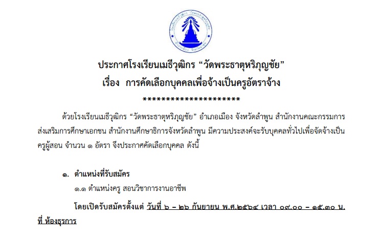 ประกาศโรงเรียนเมธีวุฒิกร “วัดพระธาตุหริภุญชัย” เรื่อง … Read more ประกาศรับสมัครครูอัตราจ้าง