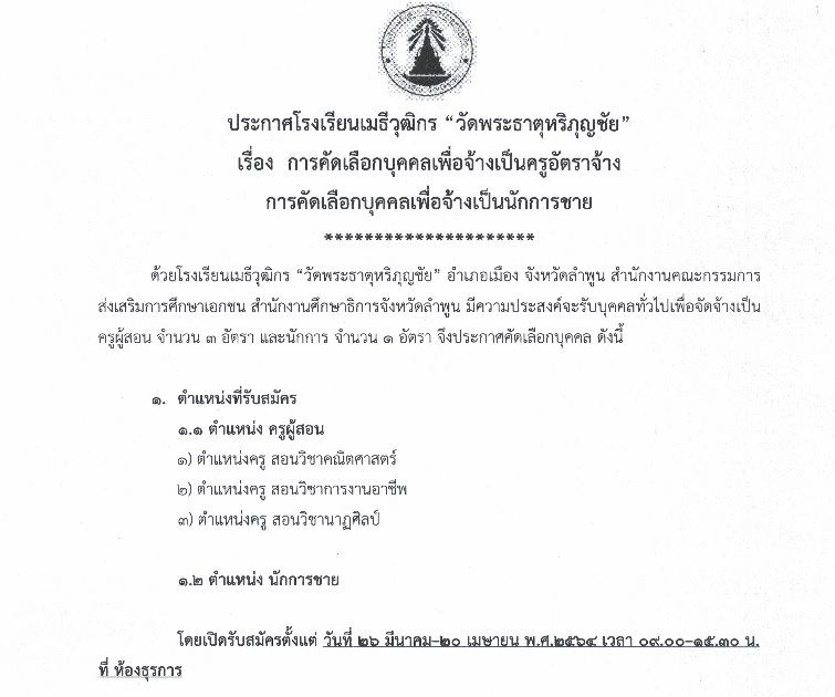 ประกาศโรงเรียนเมธีวุฒิกร “วัดพระธาตุหริภุญชัย” เรื่อง ก … Read more ประกาศรับสมัครครูสอนวิชาภาษาไทย